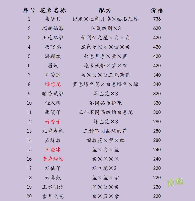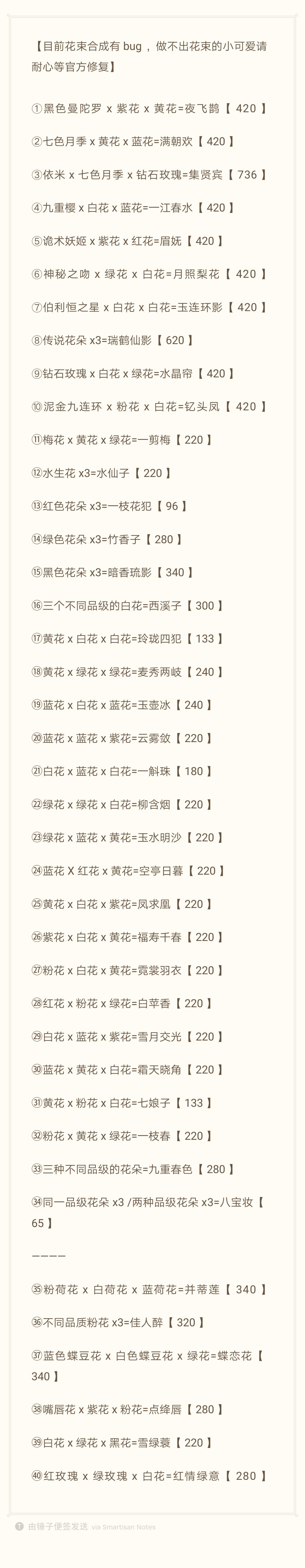 【花束已齐,善用倒序查看,排序不代表图鉴顺序】 目前已知的有32种,游戏内实装40种,还有8种还没试出来 把论坛里散着的花束配方集合了一下,还有价格。一些花束价还没测试出来如果有人知道了欢迎分享补充