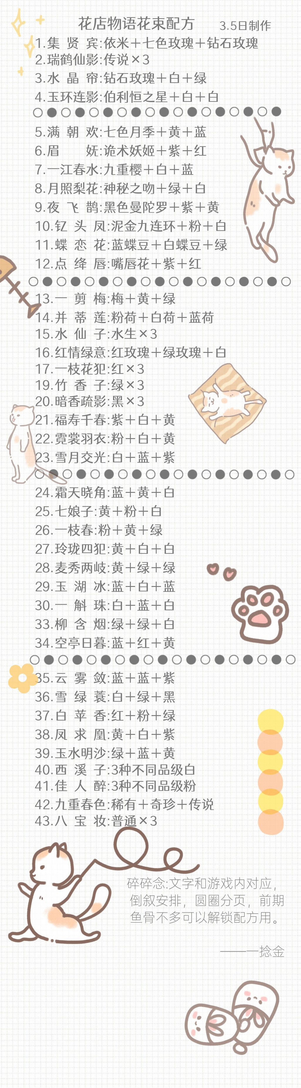 新的配方和价格来啦,有我还没收集到的呜呜,希望评论区小伙伴能补充下啦😺 翠凝红 绿x红x黄=219 雾房珠骨 石榴花x白x白=269 鲛人泪 蓝x人鱼的眼泪x白=269(成本高) 丁香结 白丁香x紫丁香x绿=520(这个超划算!) 雪山来客 白x雪莲x绿(没有雪莲,不知道价格) 普罗旺斯 紫x薰衣草x白=219(成本高) 祈 愿 绿x雏菊x黄=219 梅花三弄 绿萼梅x梅x白梅=520(没看清,好像是这么多…但成本巨高!!!!不值得…)