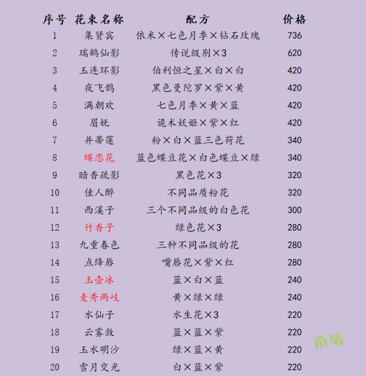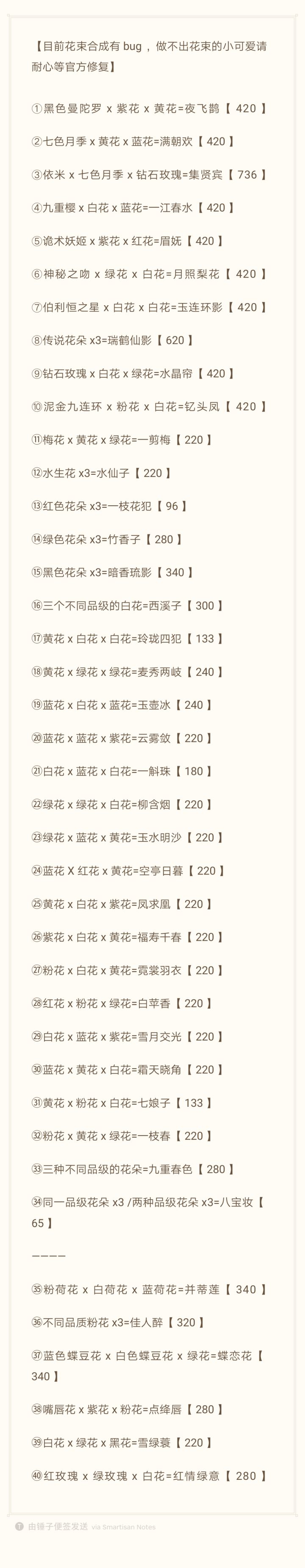 【花束已齐,善用倒序查看,排序不代表图鉴顺序】目前已知的有32种,游戏内实装40种,还有8种还没试出来把论坛里散着的花束配方集合了一下,还有价格。一些花束价还没测试出来如果有人知道了欢迎分享补充