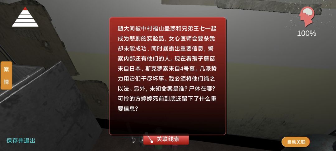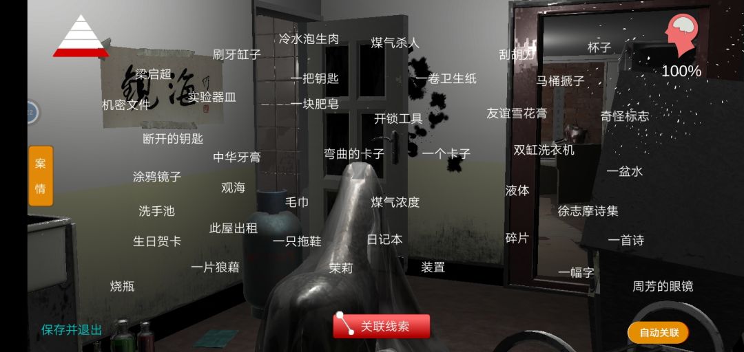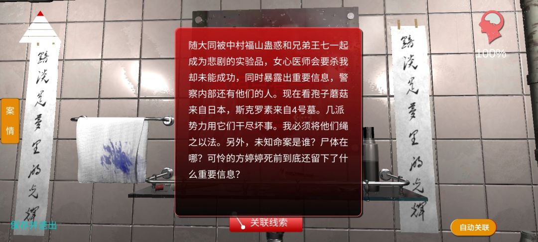 100%通关打卡 刺激! 生死48秒 钥匙位置随机刷新 但是刷点只有几个位置 1.花洒盖子里 2.冲水马桶里 3.肥皂上 4.拖鞋旁的下水道里 5.洗手池的扣里 有些线索只有带上周芳的眼镜才可以看到:七步诗、王七 关联线索: 开锁工具=弯曲的卡子+一个卡子+王七 兽化的人=冷水泡生肉+一盆水 茉莉危险=写废的纸+日记第五页 杜翠兰要杀我=煤气杀人+秘密指示 内鬼=写废的纸+争斗痕迹+指纹 女心医师会=日记第五页+奇怪标志 成瘾=烧瓶+实验器皿+杯子+机密文件 可怜的王七=王七牌位+注射剂+一张纸+七步诗+兽化的人+日记第五页 王七之死=未知命案+病理报告+成瘾+日记第三页 真相=方婷婷的手信+俄罗斯套娃+未知命案+内鬼+日记1到5页 祝各位游戏愉快
