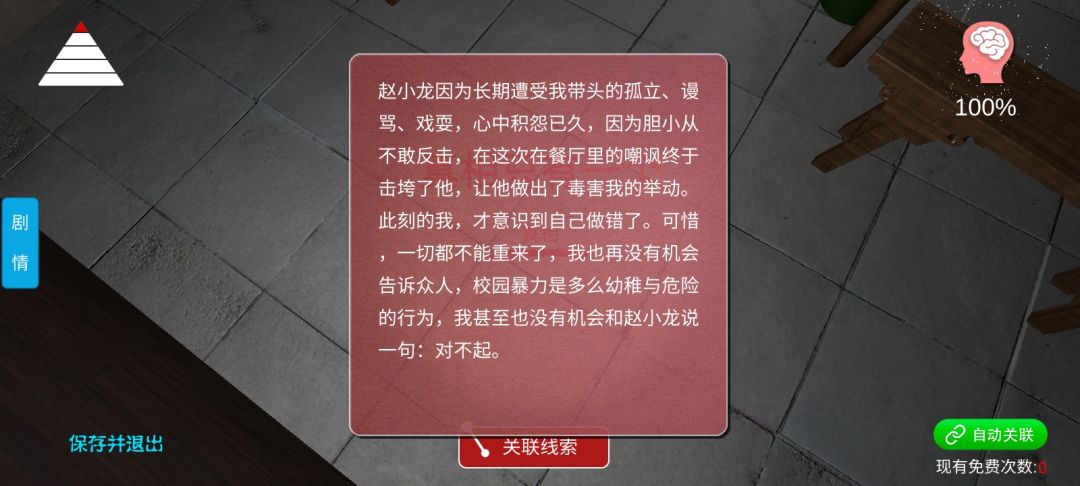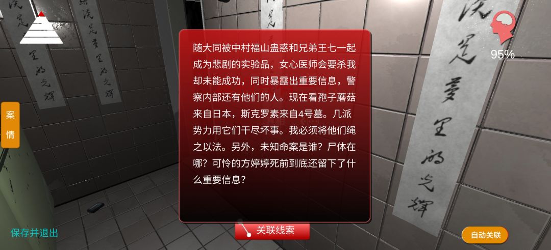 100%通关打卡 刺激! 生死48秒 钥匙位置随机刷新 但是刷点只有几个位置 1.花洒盖子里 2.冲水马桶里 3.肥皂上 4.拖鞋旁的下水道里 5.洗手池的扣里 有些线索只有带上周芳的眼镜才可以看到:七步诗、王七 关联线索: 开锁工具=弯曲的卡子+一个卡子+王七 兽化的人=冷水泡生肉+一盆水 茉莉危险=写废的纸+日记第五页 杜翠兰要杀我=煤气杀人+秘密指示 内鬼=写废的纸+争斗痕迹+指纹 女心医师会=日记第五页+奇怪标志 成瘾=烧瓶+实验器皿+杯子+机密文件 可怜的王七=王七牌位+注射剂+一张纸+七步诗+兽化的人+日记第五页 王七之死=未知命案+病理报告+成瘾+日记第三页 真相=方婷婷的手信+俄罗斯套娃+未知命案+内鬼+日记1到5页 祝各位游戏愉快