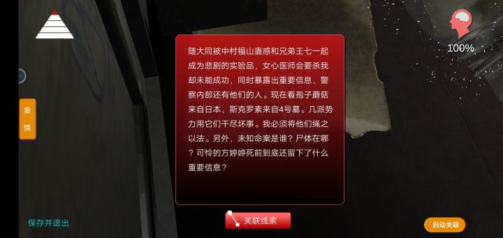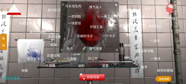 100%通关打卡刺激!生死48秒钥匙位置随机刷新 但是刷点只有几个位置1.花洒盖子里2.冲水马桶里3.肥皂上4.拖鞋旁的下水道里5.洗手池的扣里有些线索只有带上周芳的眼镜才可以看到:七步诗、王七关联线索:开锁工具=弯曲的卡子+一个卡子+王七兽化的人=冷水泡生肉+一盆水茉莉危险=写废的纸+日记第五页杜翠兰要杀我=煤气杀人+秘密指示内鬼=写废的纸+争斗痕迹+指纹女心医师会=日记第五页+奇怪标志成瘾=烧瓶+实验器皿+杯子+机密文件可怜的王七=王七牌位+注射剂+一张纸+七步诗+兽化的人+日记第五页王七之死=未知命案+病理报告+成瘾+日记第三页真相=方婷婷的手信+俄罗斯套娃+未知命案+内鬼+日记1到5页祝各位游戏愉快