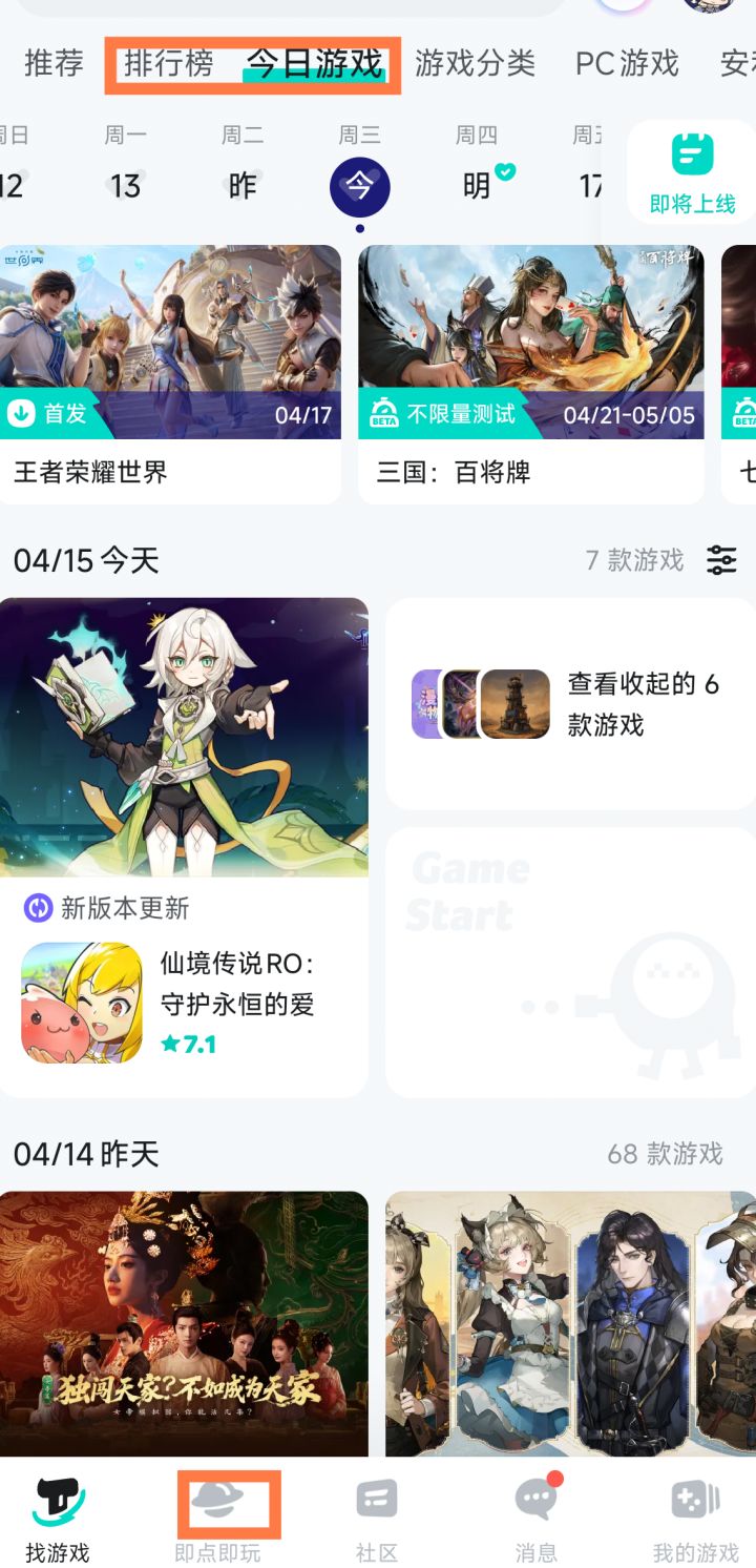 突然发现原本排行榜变到上面了,下面变成即点即玩了,这到没啥,但是怎么改变上面的顺序呀,我平时到今日游戏里面签到,划一下就好,但是现在还得伸手指去点今日游戏,感觉变麻烦了一些,想把今日游戏放回第二个位置