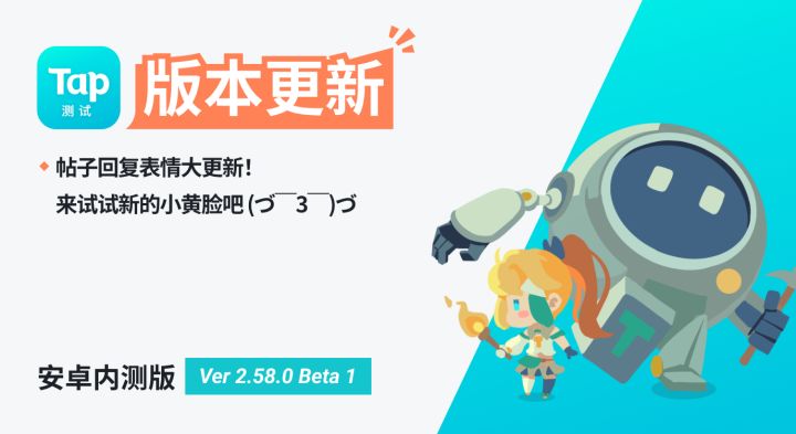 Hello,各位 Tapper :我们今天发布 TapTap Android 内测版 Ver 2.58.0 Beta 1,一起来看看本次版本的更新内容吧~◆ 帖子回复区交互优化,还增加了新表情哦!除此之外,这个版本做了以下升级:解决了因 hook 无法启动的问题优化了 Tap 内存优化了首页加载速度以上就是本次更新的全部内容,欢迎大家体验并反馈!最后的最后,试试给嘴替发言点赞叭!有
