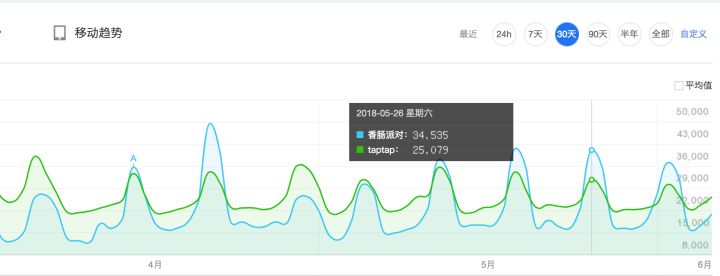 经许多用户反馈,我们已经检查了所有下载量统计数据,并未发现可疑刷榜现象。部分玩家在近期发现,《香肠派对》经常会冲上TapTap榜单首位,我们根据数据分析,也与心动的运营同事进行了沟通,主要是因为《香肠派对》将TapTap视为其唯一官方下载点,大量的玩家因此来TapTap下载,所以导致了下载量的波动。以下是来自百度指数的截图(百度指数为大部分网民搜索热点趋势):可见,香肠派对从4月起的许多周
