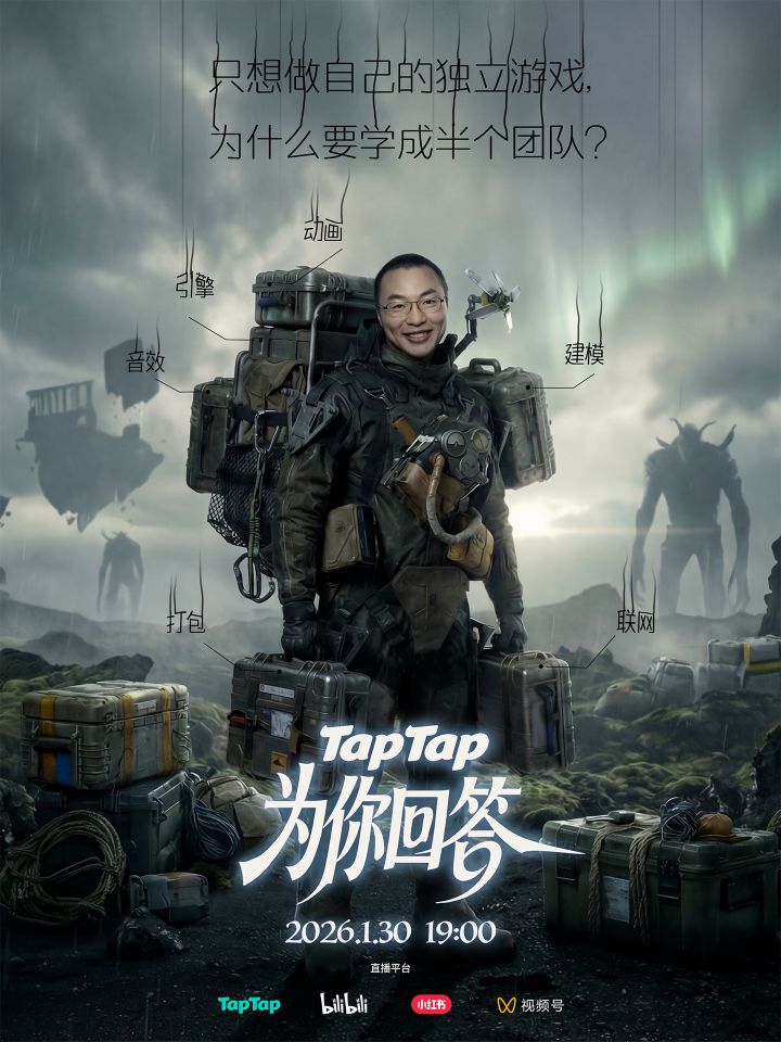 引擎、框架、建模、贴图、动画、音效、联网、打包……不是不够热爱,是一个人真的扛不动。很多游戏梦,就是这样被重量压垮的。但如果有一天,你可以放下这些负重呢?1月30日晚19:00,TapTap创始人黄一孟,在直播间为你演示全新路径,打破“全能”枷锁。