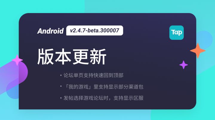 hi,各位 Taper:我们刚发布了 ,一起来看看本次正式版的更新内容吧~※新功能• 论坛单页支持快速回到顶部不论是论坛单页、子版块单页、官方、视频等Tab下,只要单击最上方名称就可以回到顶部,双击还可以回到顶部并刷新当前页面内容哦~• 「我的游戏」里支持显示部分渠道包更新后,你在其他平台下的渠道包,也可以在「我的游戏」中显示并打开,渠道包当前还不支持展示游戏时长。目前我们只支持
