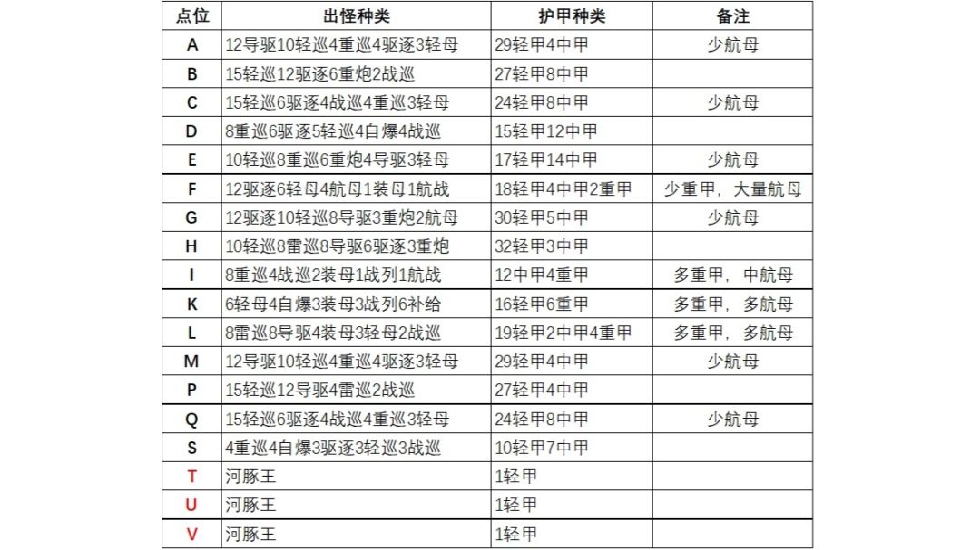 a,c点有夜战 t点好像没有夜战 g点好像也没有(刚刚好航母吃油) j点好像也没有 左路捞利根 直接双重巡双航母,八咫船不多不少(就上两个八咫航母就行了)航速34及以上吃油电 1, 道中推荐(不包括g点,因为这里容易炸后排) 穿甲重巡,如明尼阿波利斯(70级永恒,无奶可单带。实际应该更低) 通常弹战列,如俾斯麦(同上)(多船加油耗了,不太推荐) 大部分重巡战列好像对中甲伤害都是高,应该练度差不多的