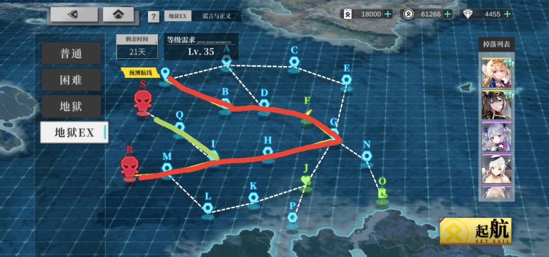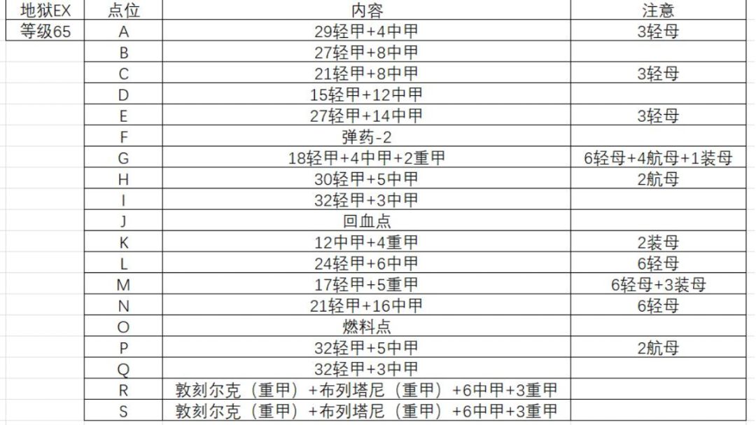 前言:缺伤害或者奶的可以加船,加完后看一下路线还对不对,尽量不要使用推荐配队以外的活动加成船,避免路线诈骗 地狱EX 下路BDGJNQRV 条件1:美船≥3 条件2:重巡旗舰=1 条件3:舰队均速<32 优质备选:女灶神(航速16)、拉菲724改(航速34)、北卡罗来纳(航速28)、明尼阿波利斯(重巡、航速33)、兰利(航速16)、企业(航速33)、新泽西(航速33) 最简配队: 注意事项:D点存