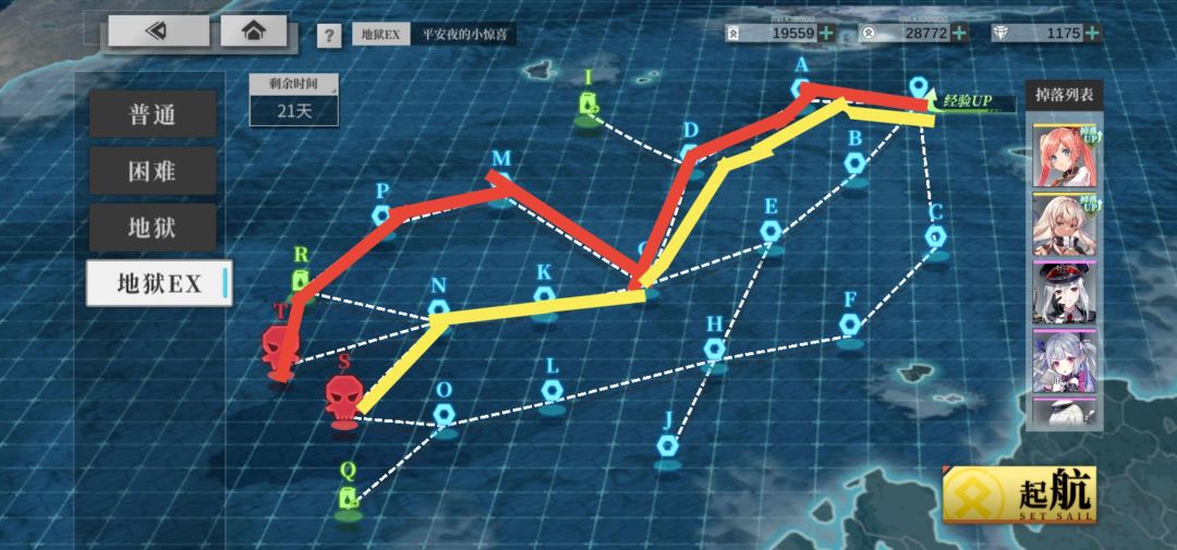 【平安夜的小惊喜】ex较低配置TS双点攻略 这次整体难度全在关底boss那里,道中不管是生存还是输出压力都小,带路条件也很简单,尽量走上中路里面的小怪没有航母啥的。 如果想练航母的话就只能走下路,道中小怪航母较多,请注意后排别被炸残血。 T点配置如下 1队 雪风+凌波 2队 云鸱 木枭 埃罗芒什+花园 金之谜团 1队走道中,2队后排两个尤奈特船,走红线条件T点 1队走道中,2队后排用洛蒙瑞亚的胡