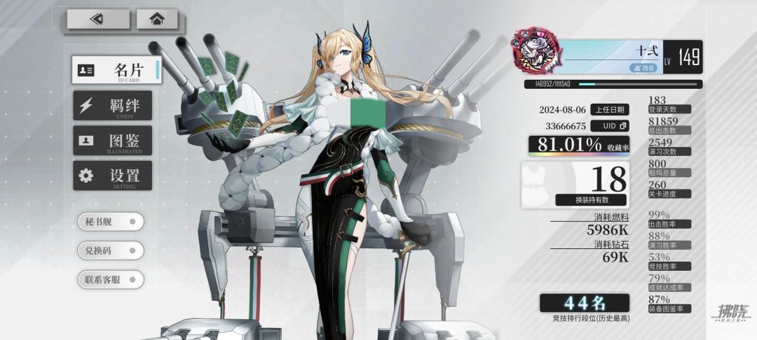 总共出击2639 排除多捞和中退记2600出击 摸奖433次 捞满9只 出金率2.1% 本期活动说实话很简单,注意道中炸后排,BOSS输出不足超时,都不是问题 但是不好练航母,还没油点...