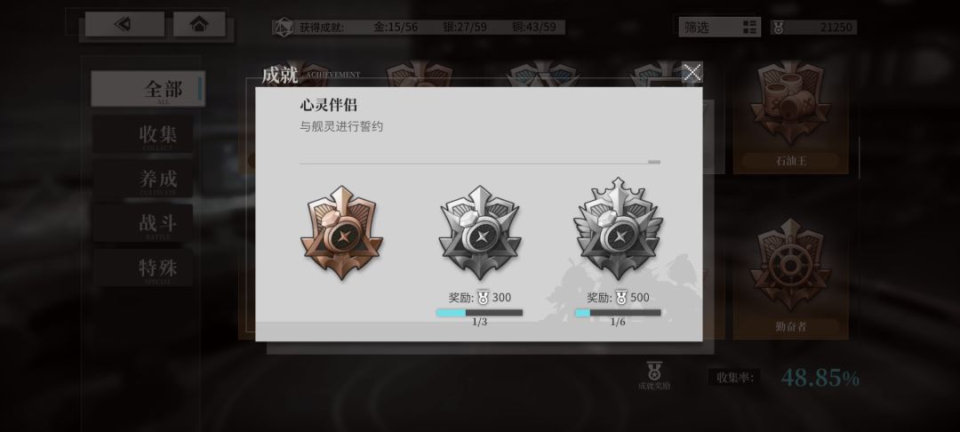 心灵伴侣:看婚舰数量,一铜三银六金。这是瞧不起我吗,我要婚全员! 相遇与离别:退役5000船就能拿金,很快的。 失败者:统计主线关卡作战超时次数,300金。1+1挂13-10可能会较快达成。 名人:累计消耗钻石150000拿金,也就十来个戒指。 元帅:累计消耗500000油拿金。老登不说了,小登估计达成的也不少了,达成之后就看不了消耗数量了。 英雄:累计消耗10000功勋拿金。 海藻碎屑:需要演戏