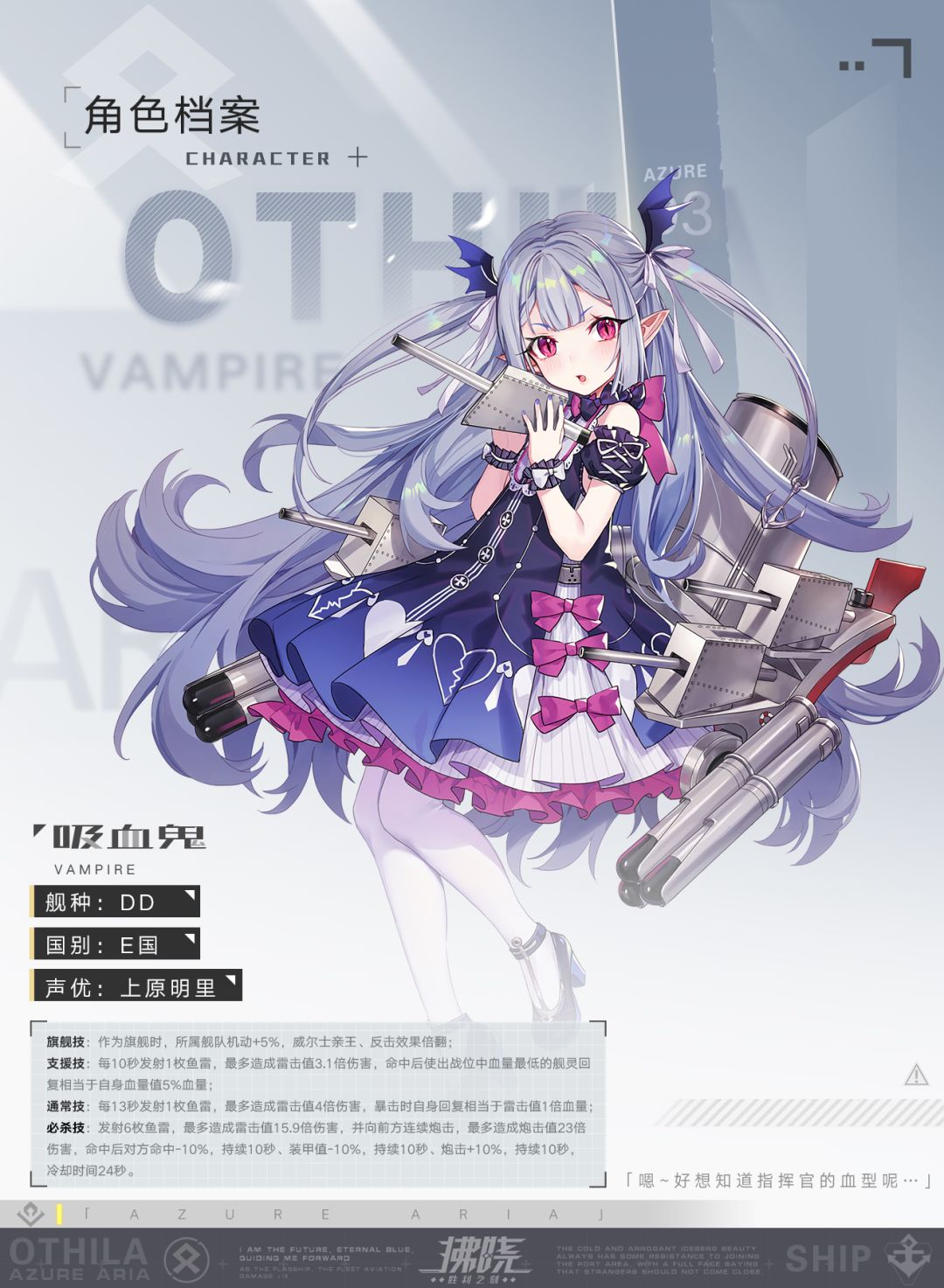 ——嗯~好想知道指挥官的血型呢… 【OTHILA加密信息,正在破解...】 「虽然她一直自称是吸血鬼,但其实并不是,年龄一直是个谜。最喜欢甜点和草莓,也喜欢红色的饮料,比如草莓汁、红酒等等。虽然嘴上整天说着想尝尝指挥官血液的味道,但实际上见到真的血就会晕倒,平日里与威尔士亲王和反击感情深厚。」 ——最新欧瑟拉资讯—— 指挥官,赶紧加入我们的官方Q群掌握一手消息叭! 拂晓官方群①:105978749