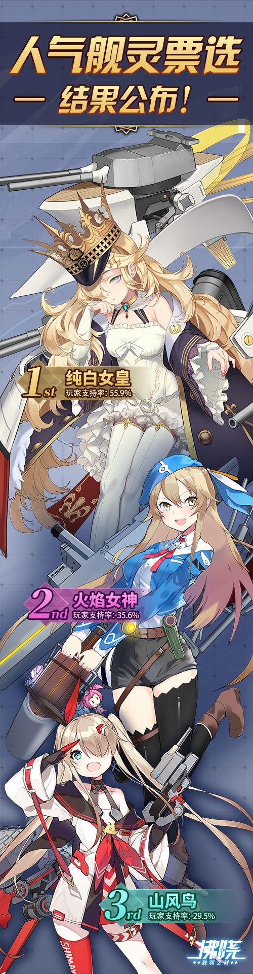 指挥官! 感谢参与《拂晓》人气舰灵票选活动~ 经过一周的投票,第一届玩家票选“人气王”舰灵诞生啦! 快看看本次活动中,你心目中的她是否获奖了呢? Akari将尽快安排「纯白女皇」的限定Up概率卡池和皮肤返场活动,敬请期待! Tips:活动参与奖励将于5月5日更新时发放,届时请在游戏内的邮箱查收~