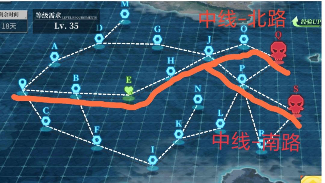 所有船的技能一级即可 一队吸血鬼出战,比叡支援,旗舰选比叡 吸血鬼练度如图(就靠你了,吸血鬼👍) 比叡等级最好40级以上,防止被炸到半血以下奖励变差,练度如图 二队敦刻尔克出战,伦敦、列克星敦支援,敦刻尔克旗舰 敦刻尔克与伦敦只要水个25级能上场就行 列克星敦练度如图 配好后(索敌250以上),路线如图 阵型用梯形阵 二队打B点,剩下全部交给一队即可,所以你的二队只要能蹭过B点就行了,练度不严格 而