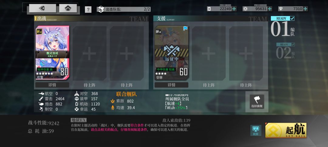 录于ex路线修改后,出门减弹药点已变为回血点。 托管顺序212221 合计油耗51x4+97x2=398 活动凤楼舰灵6星加成有点累事,应瑞20油耗变24。后面如果能改成临时强化可选最好。 理论上1队只打减弹药点,2队打其余道中+BOSS五战能达成最低油耗,但能完成该操作的[驱逐]空想、小拉菲已满级或接近满级。另一方面,这种打法对2队配置更严苛,即使四船队少打一战,二船的后排油耗也会增高,实际一轮