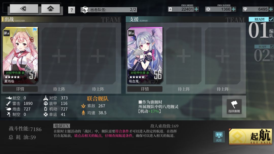 地狱EX虽然把限制等级从45降到了35,但关卡中怪的等级没降,难度也就和之前一样,所以托管练度要求仍然和先前一样,话不多说,直接上干货~ 一、地狱托管配置(以托管EX为目的,即在地狱练航母和战列) 一队:1驱逐(40级以上三星祥瑞御免/40级以上三星山风鸟/45级以上五星风舞姬)出战,1航母旗舰+夜裔/哈曼支援(祥瑞御兔出战可不带加血驱逐),道中5战 二队:1战列/战巡+2航母出战(航母旗舰),雾