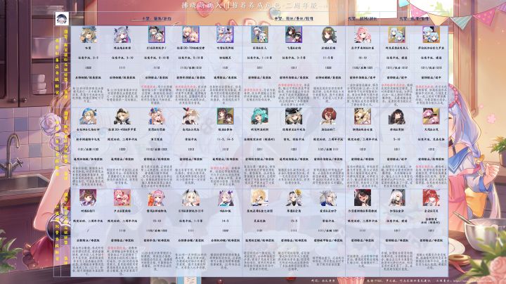 拂晓已经迎来二周年五天啦,不知道大家新版本的体验如何呀,最近在QQ频道和Tap评论区闲逛时常看到有萌新入坑提问,有着各种诸如二周年卡池抽什么、前期练什么、怎么搭配队伍、怎么选择天赋等疑问,相信这个图应该能给刚玩的朋友消解一部分疑虑。该图是以目前能获得的所有角色(常驻获取+目前活动获取+二周年庆典卡池)为范畴,未按梯度而是以三块(易获取重点养成+难获取重点养成+推荐次要养成)内容进行推荐,同排推荐