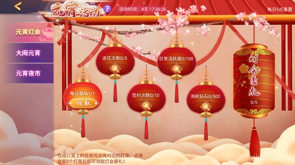 亲爱的老板们:未出元宵都是年,美食协会为大家准备了全新元宵活动——喜闹元宵!轻轻松松做任务,欢欢喜喜闹元宵!快来参加吧!活动开启时间:2021年2月26日05:00-2021年3月3日05:00元宵灯会——做任务拿奖励!美食协会为大家准备了总计5盏花灯,每完成1项花灯任务即可点亮1盏花灯,每盏小花灯均可获得“元宵汤勺”,点亮5盏花灯,可领取每日大奖“灯会豪礼”,内含:元宵限定称号“喜闹元宵