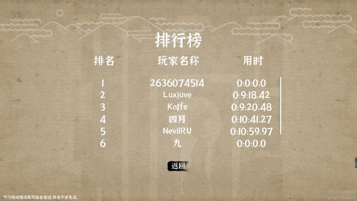 经过一周角逐,目前速通榜的前五已经诞生: 部分用时未显示,但排名顺序无误全收集榜就比较凄惨了,目前只有两位玩家通关:由于参加此次活动的人数不足预期,而我们事先已经准备好了礼物,所以接下来的一周凡是参与了速通活动的玩家都有机会获得我们寄出的礼物,很多小伙伴的时间确实比较紧张,我们也自知在预算有限的情况下提供的礼物或许不具有足够吸引力,与我们而言,无论你关注过或是支持过这次活动,都在这里表示由衷
