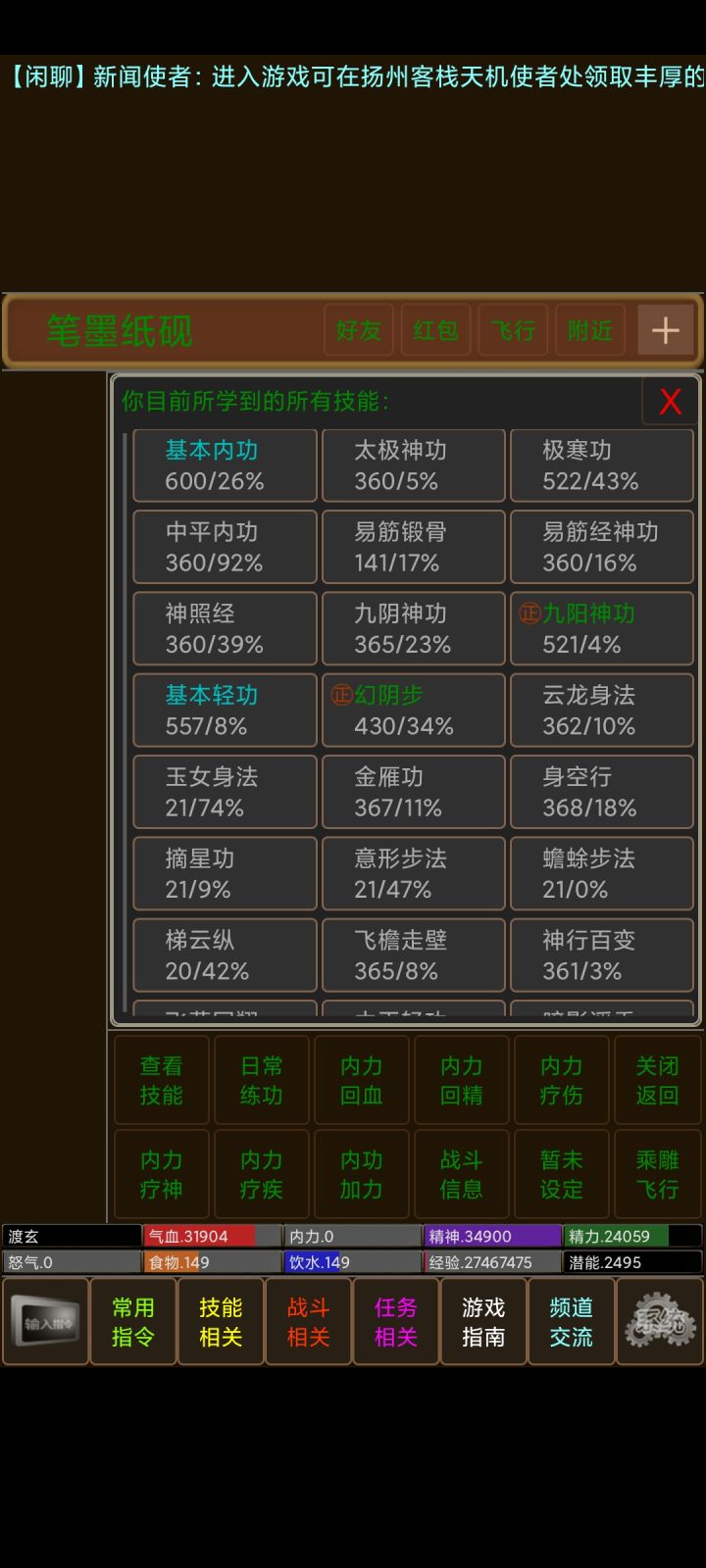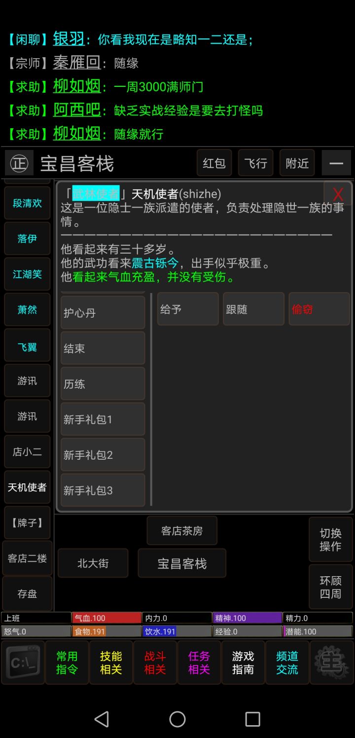 1.很多萌新看到自己的食物和饮水空了,十分害怕,到处询问如何获得食物。其实不用害怕,开局就送30天会员,会员是不会饿死的,并且16岁之前是饿不死,那肯定有人要问了,那还没会员了怎么呢,不用担心去扬州醉仙楼店小二那里买上一个烤鸭和牛皮酒袋,实惠又管饱2.会员可以在天机使者那里领取天王护心丹,这可是好东西呀,能完全恢复自身伤势,并且补满内力上限2倍的内力,简直不要太爽,并且cd为1s,一直能用到5