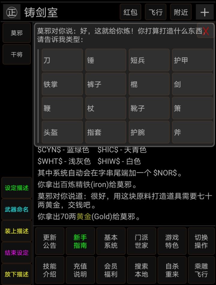 1、要有材料。商城中有补天冰蚕玄冰寒铁乌金丝等材料。当然,如果第一次做可以拿扬州铁匠铺卖的百炼精铁来练手。2、有了材料,还要有钱,从70金到210金都有,越好的材料打造费越贵,如补天冰蚕要210而百炼精铁只需七十金。3、钱和材料都有了就可以点乘雕飞行去到铸剑室,先给莫邪材料再给钱,就可以开始打造了。然后选择自己想要制作的装备种类,这里我做的是把刀。如果不点助我装备属性会低一些,贵重的材料都要