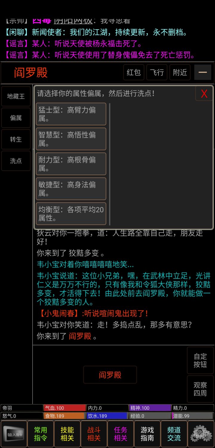 游戏大题分为五大流派1.首先新人一般首推 悟性流悟性流对应的性格是狡黠多变,偏属自然是智慧型了悟性不必多说那自然就是学东西快,消耗的潜能少,不败busy也是十分好用2臂力流臂力流的性格一般为光明磊落或者心狠手辣加点当然是偏臂力了臂力流就是一个字莽,无他莽就完了臂力因为缺乏悟性自然学东西慢,消耗大了因为低悟性所以能学左右互搏,所以一次能丢2套技能,简直不要太爽3身法流身法流当然就是做太监了