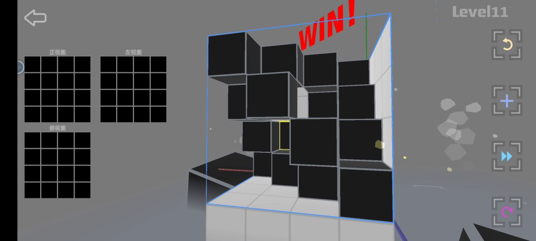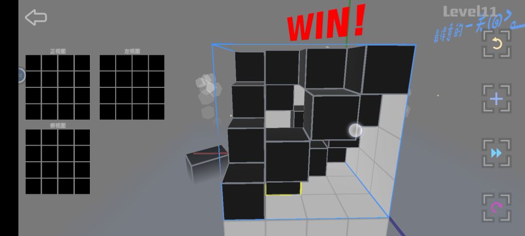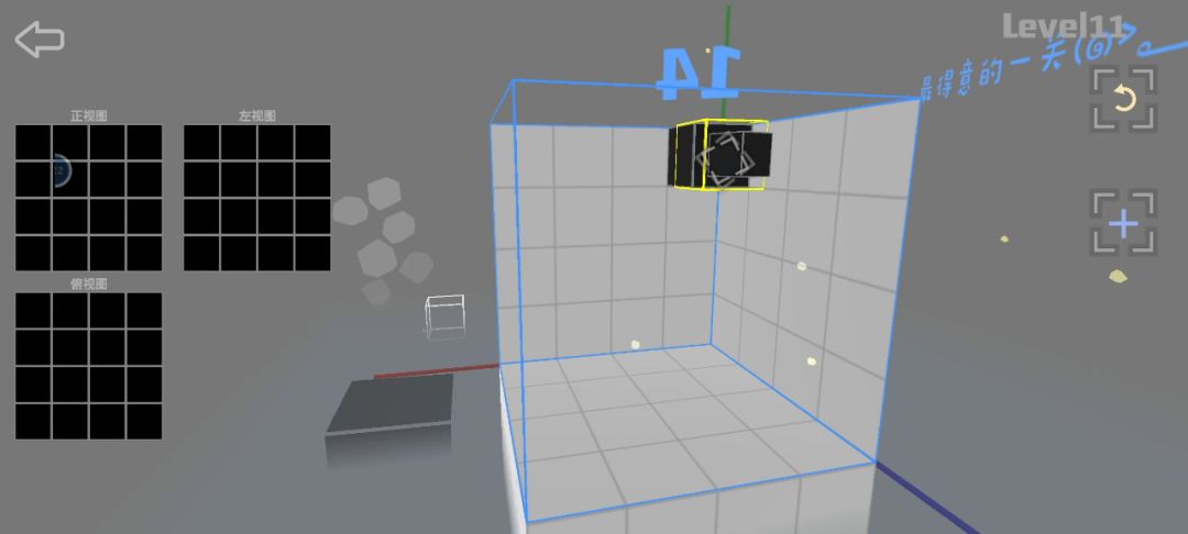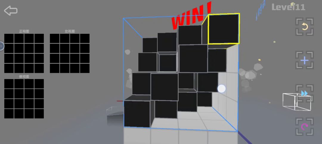 11关无论哪种解法都有规律,我理解的是因为共有16个方块,且4×4=16,所以每层或者每列都应该有4个方块。只要达成每个方块互不遮挡且每层每列都有4个方块的条件就ok
