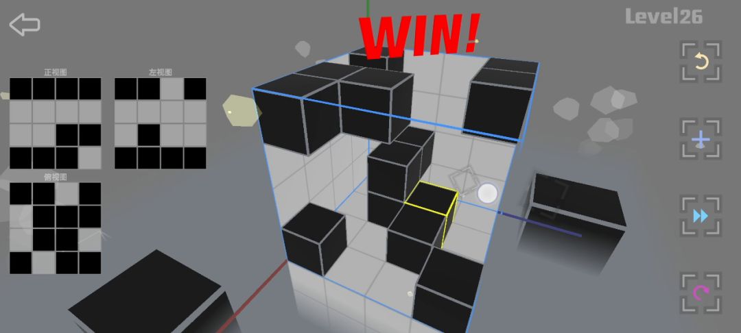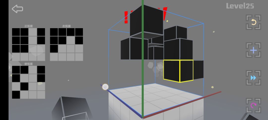 玩了有几天了,发个笨蛋傻瓜式解题思路,不求最优解,只求最快。先俯视图,再找正视图与左视图的相同点,再正视图,再左视图。没有方块了就俯视图拆一个补一个,悬浮建块也是搭建完拆除掉。当然每一道题都是有很多种解法的😁