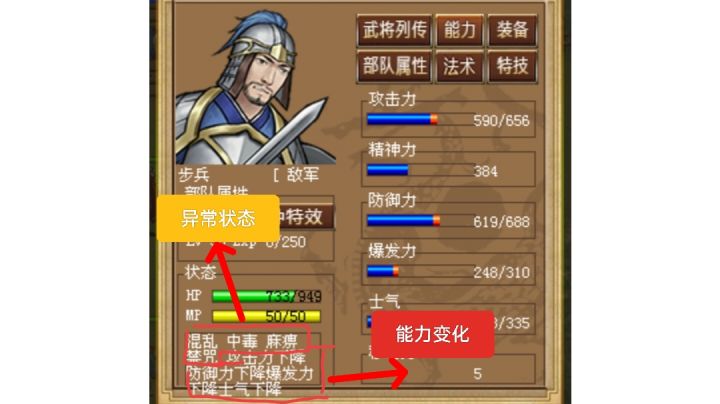 一、buff种类说明二、buff功能说明三、buff持续时间探究四、buff释放时的相互影响五、buff与特殊宝物相互关系六、buff与特殊特技相互关系七、与buff相关的法术一、buff种类说明1.豪曹buff主要分为两类:异常状态和能力变化 (1)异常状态种类主要有混乱、麻痹、禁咒、中毒这几种 (2)能力变化种类主要有攻击力/精神力/防御力/爆发力/士气/移动力这几种,