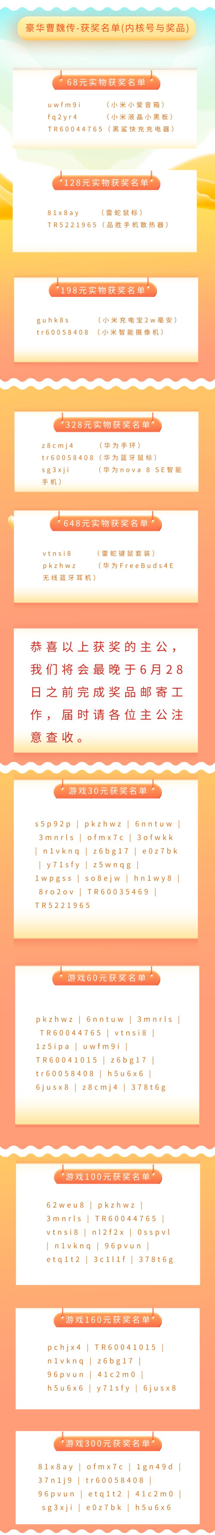 再次恭喜以上主公获奖,如有疑问可联系官方客服:787096020希望各位主公能够写下您对这次周年庆抽奖活动的意见和看法。相信各主公的建议和意见,能帮助我们把之后的活动做得更好。
