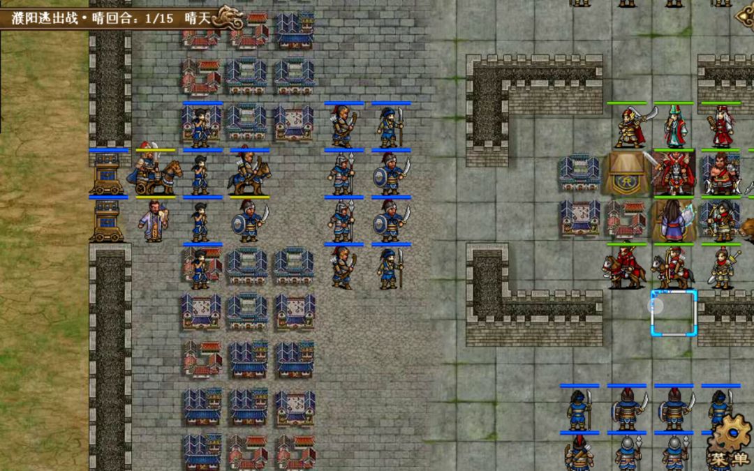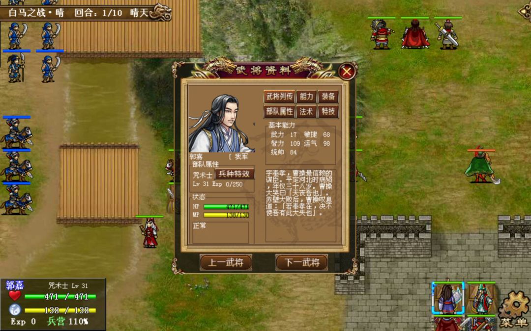 本版本敌军高顺装备护心镜(原装备吸血葫芦),每回合恢复20%血量,对毒基本免疫,指望友军下毒击杀高顺无望。 濮阳一风天野战,曹军三法师施放龙卷可以轻松做到一回合击杀护心镜高顺,濮阳二城战,不能吹风,难度大了不少。 步兵减伤20%,加上弓骑打步兵克制85%。夏侯渊的反击如同抓痒(还不如明光铠反弹收获可观)。重新列队后算上候成9个步兵,只能靠下毒单点和火阵群伤。除了鸿鸣刀李典和霸王枪夏侯惇外,其他人打步兵根本打不出伤害。 友军继续给力,全场带走13个兵(包括高顺和4个同样头疼的武术家),最后典韦出城反击收掉人头。 过关后得到赤影甲,初始增加21攻击和42精神士气,这在前期低等级时简直神器(想想汜水关和董追的步兵敌将李榷装备的还是赤影甲,估计无法打)。 9级董追击战被鬼谷子徐荣卡住了,18级濮阳三不好杀大饼高顺。