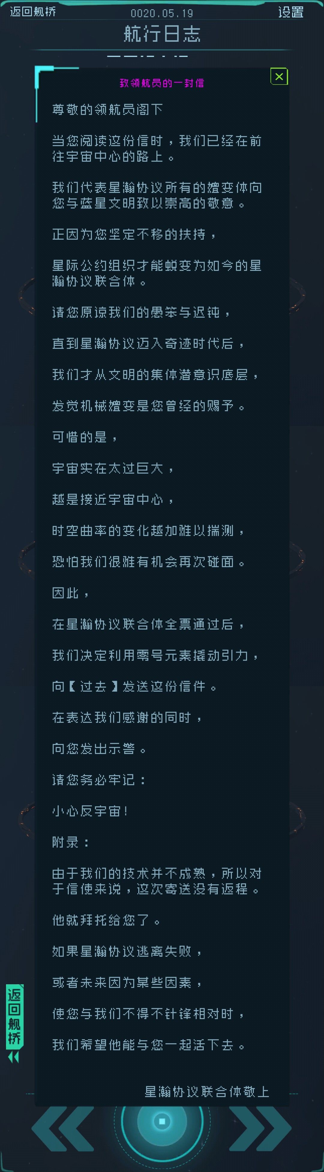 类型:航行日志 致领航员的一封信 文明:星瀚协议 星球:6(工厂星) 附1:星瀚协议信使,即莱温,这是一位注定的星约星之子 附2:小bug,这里星瀚协议提到了领航员,而非蓝星文明,说明他们已经洞悉[领航员计划] 附3:星瀚协议是十分忠诚的文明,尽管领航员打击了星瀚协议,它也不一定会反击。 如果有兴趣,可以看一看有弦的同人