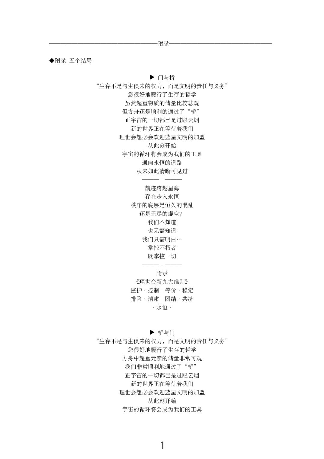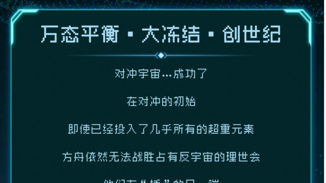 此游戏总共五结局 大撕裂、大反冲、创世纪、桥与门、门与桥 首先来说说大撕裂吧 相信很多萌新对这个结局都不陌生吧?翡翠结局为纷争再起然后共生就行了可以时不时收割一下 最后为了避险协议选择了逃离,进入反宇宙 然后提示说反宇宙满目为敌,你是否准备好了? 然后来说说大反冲 灭掉全部星球,进入空想时代,一人干爆整个理世会,开启对冲,成为新宇宙唯一的神。最终超越了所有文明,成为神的存在,创造了蓝星乌托邦 这个
