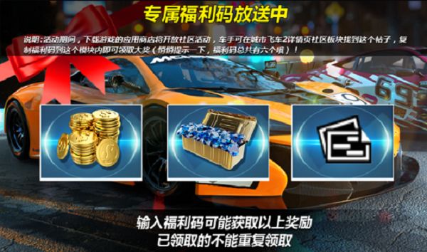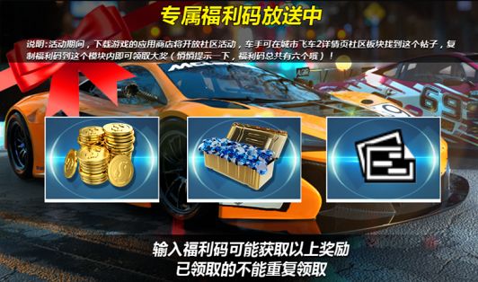 《城市飞车2》首个通用福利码放出!我们会在接下来持续放出通用福利码,车手们要留意社区动态哦!福利码2:CR666福利码3:8888*如何使用福利码?步骤一,复制该福利码,打开游戏公告栏目。步骤二,找到“ 专属福利码 ”点击输入福利码!--------其他福利: