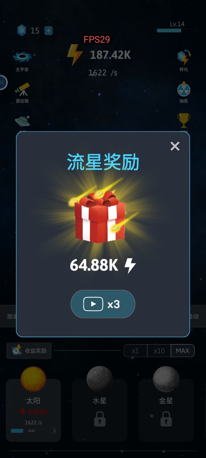 有些东西需要看广告,我点了半天也没用就没管,结果太阳系最后一个星球居然需要看广告才能解锁,这不为难人吗?说退吧,这么久的时间与努力白费了说继续吧,啥都干不了
