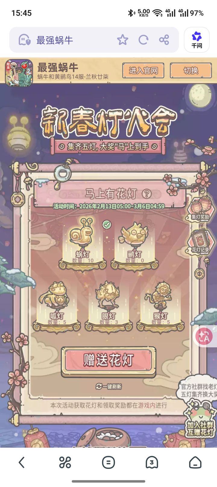 如题,楼主新人换完礼包后还剩不少灯,看有没有人需要的,看到后免费送,送完即止,剩余的灯如图所示,先到先得。