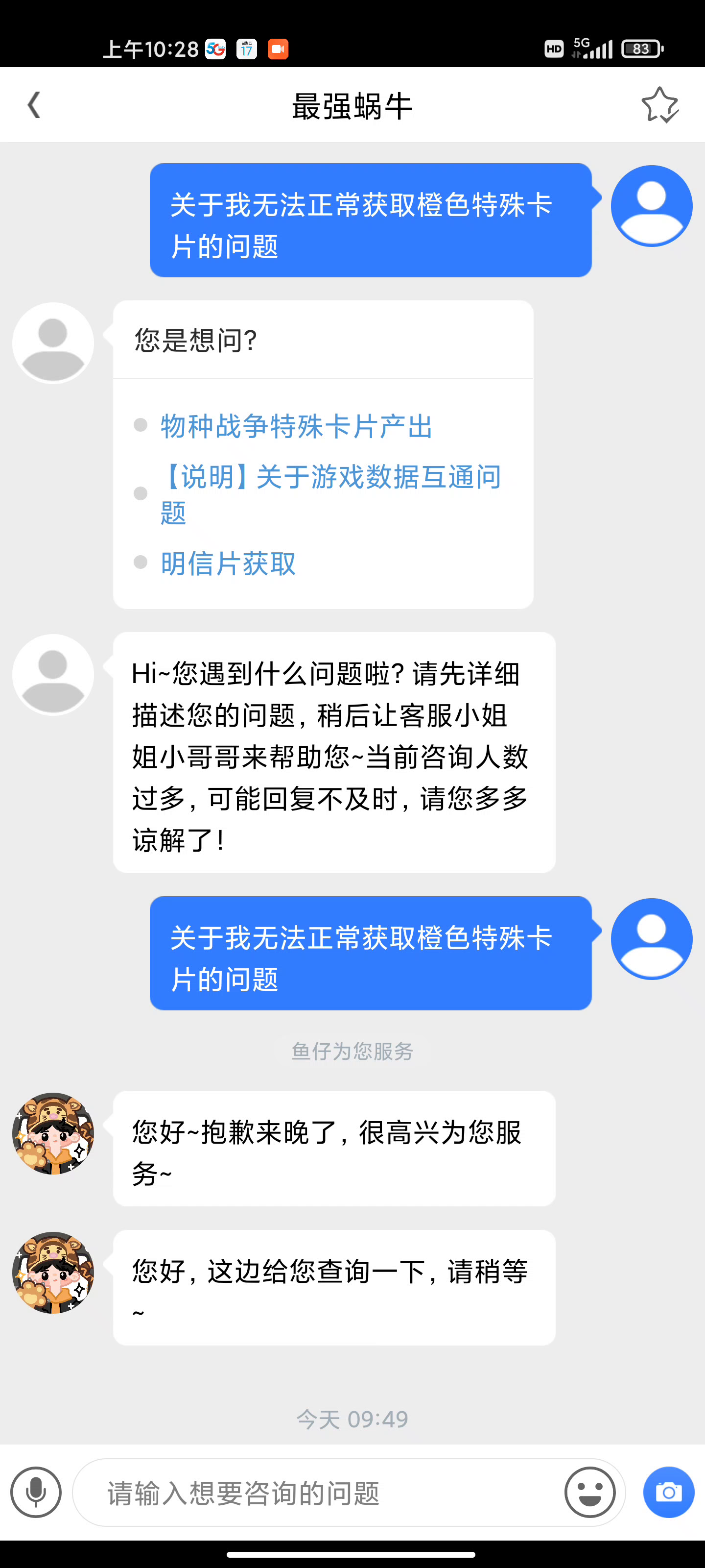 关于我时空图一个月获取两张橙色特殊卡片的问题与反馈 在我时空图兑换完特殊橙色卡片之后,我就没出过特殊橙色卡片,我就去和客服反应这个问题,三天反应三次 三个客服的回答都是这个是概率问题,多探索总是有的。 听到这我很愤怒 ,直接报上ID让查数据 今天9.10号,查出数据我上一次获取橙色是在8.29号,再上一次是8.12号。 我说这已经不是概率问题了。给出的回答是技术部排查这是正常的。 正常。。我一整个八月份算上加速至少60趟时空就两张特殊橙色卡片。果然够青瓷果然够正常。今天的客服态度很好,但是技术部给的这个答复我不满意