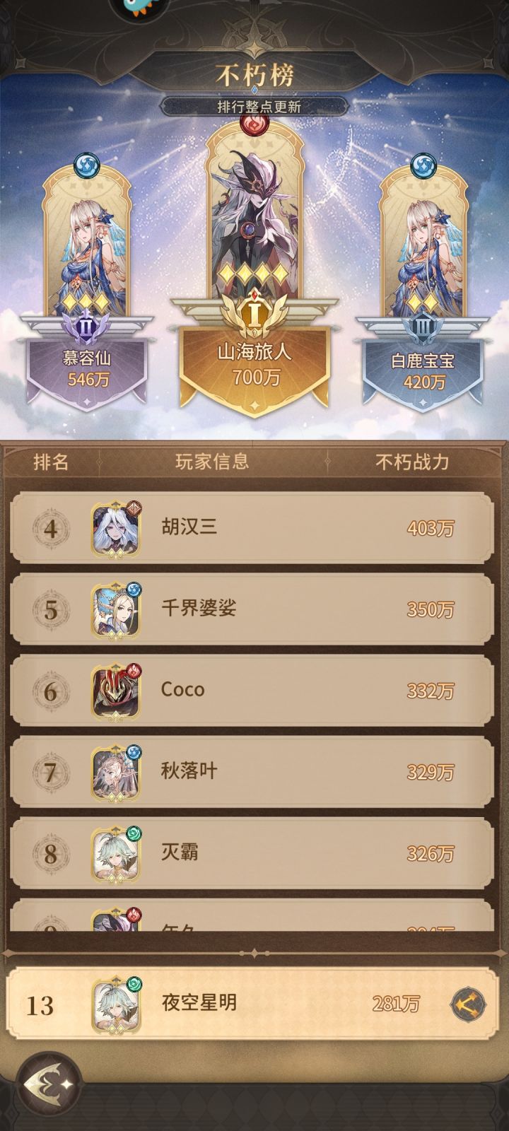 以上图解为“英雄传说”赞助,其目前为这个版本第一个通关者。为其祝贺!1.如图一为“万马奔腾流”不朽者搭配,带四输出不朽者(有感电,伤害高,有增伤加成的优先),其中诺亚必带且二号位置固定不变,若PVP中迦尔赫在三星以上可以破例加入三号位,风系使用效果最佳,其他系也可以适当用用。图3-图9为13费-19费阵容图解,实测在荒古山脉开始以后表现优秀,越往后的图,实战效果越好。“万马奔腾”讲解:以龙骑,龙
