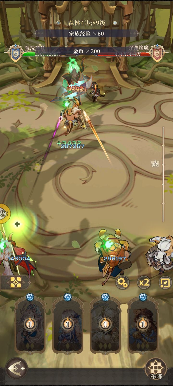 如下图 精灵之森的怪物强度反而不如无尽之海因此采用前排牛头单T即可 完全扛得住的因为后排上牛弓和牛奶 提高输出与治疗能力