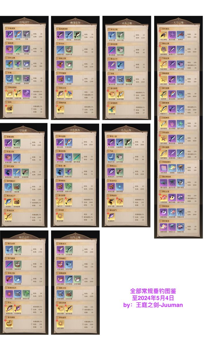 截止5月4日所有渔场图鉴(天空之地开启42条鱼)后续等天空之地地图全部开完会继续更新目前楼主鱼漂鱼线都62级可钓齐,已标所有金色鱼的大小类型引荐码:IV09DE661726F40000