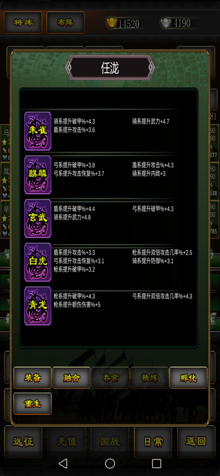 现阶段神兽装备蚊子腿属性,融合却贵得要死,即使超级氪佬合完后,神兽蛋就堆在仓库成废品,不如重新改改:1.主角身上的神兽装备改为可以升级,等级上限等同于主角自身等级。2.各神兽装备除词条外,固定增加属性,青龙加统,白虎加武,朱雀加智,玄武加政,麒麟加魅。(每级增加0.1,那么50级就加5点,也可以考虑再加点其他属性,攻防兵力这些基础的,让升级神兽装备更有意义)3.原来的<融合及重
