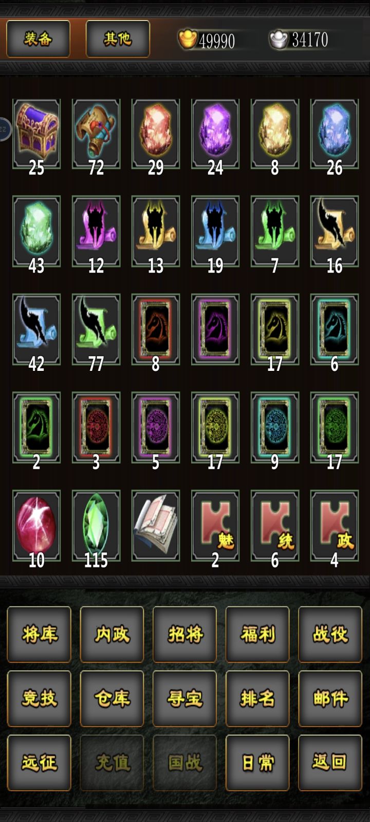目前共远征45次。基于个人经验哈,后面持续更新1、收益,十连最好的是5紫一红(1次),最差是0紫一红(8次),平均不到2紫一红。在去的路上,还能随机对十个武将进行招降。2、消耗,因为十连必出红,所以基本十个一起用,十个远征资源共要2000白银,一亿金币,2000万粮食,2000万铁,十个藏宝图。3、武将,因为路上有招降,所以建议带魅力高的,不需要打架,等级无所谓4、性价比(针对我这种资源不