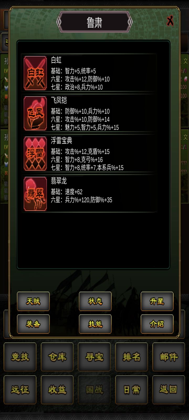 今天刚入坑的三国战线100%,感觉还不错,闲着无聊统计了下每个关卡能抓的将和具体数据,后面有新人入坑也可以看看,目前推完黄3,正在练级,后续会继续更新。黄1①张梁(枪) 武74 智50 政52 统70 魅75②程远志(枪) 武69 智21 政24 统71 魅32③武安国(骑) 武80 智30 政30 统66 魅37④张曼成(骑) 武73 智45 政40 统72 魅40⑤马元义(骑) 武