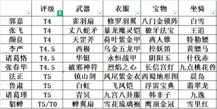 前言(T0/T1合集) 各位主公你们好呀,我是姜逊,想必大家都很关心自己抽到的红装是否强悍,属于是什么强度的套装吧。闲来没事,在群里吹水,忽然一阵强迫症袭来,便决定写一篇相对公正,基本依靠数据说话的红装分析。以帮助各位萌新和大佬主公们对自己的运气有一个更加直观的了解。想知道自己的运气底如何,开出来的红装到底是个什么水平,快来对照看一看吧。再此先附上自己拥有的红装,个人认为还是有点运气在身上的。这