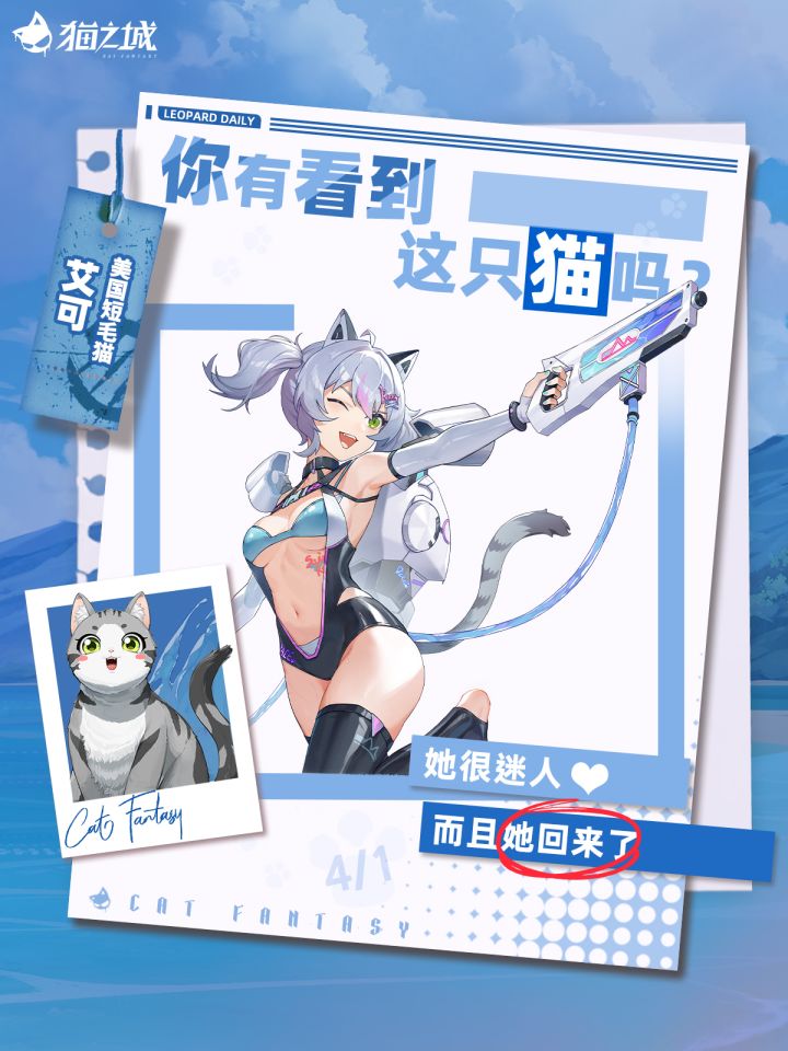 还记得古灵精怪的美短猫艾可吗?「调查官,其实艾可的飞行器可以承载两个人的重量哦…」狡黠的小猫悄悄靠近,意欲发出独家邀请…不知道调查官大人会不会接受呢?最好的时机即将到来。这一次、跟她去海上看看风景~________________~限时复刻即将开启~4月1日起,「艾可-激潮之夏」活动召唤限时开启,调查官,这次不要再错过了喔~