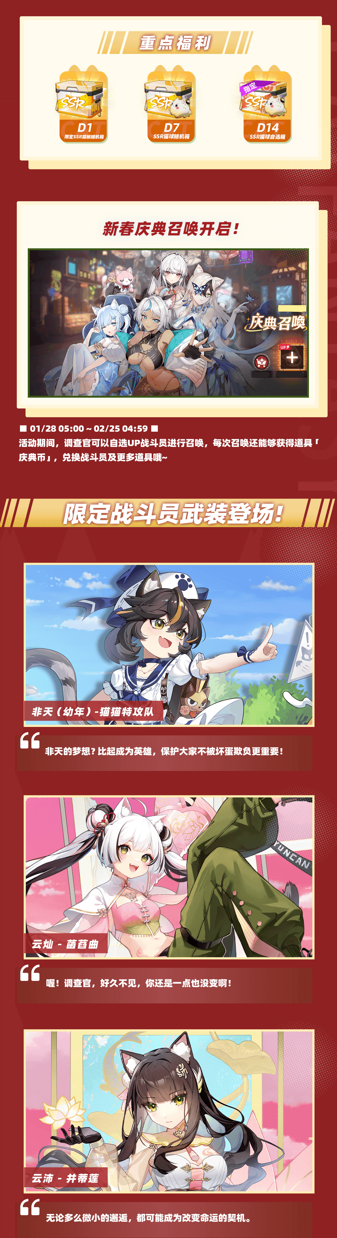 调查官大人,登录领猫娘啦!节庆副本活动、免费福利、限定召唤…… 丰富内容即将上线!活动内容已为各位调查官整理好,点击转发保存,就能防止错过活动啦~※当情报与游戏内不同时,请以游戏内容为准哦~