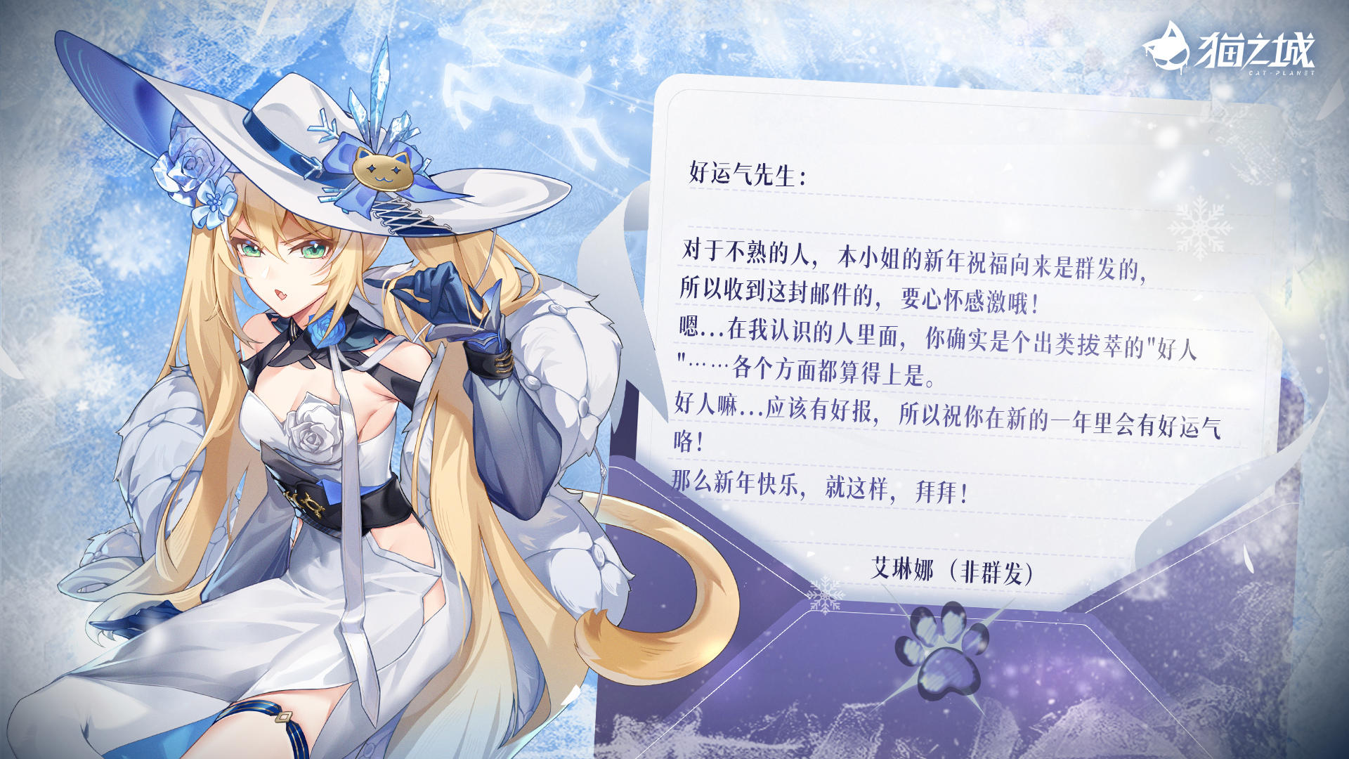 您收到一封新年邮件,来自艾琳娜(非群发)……非群发三个字,似乎是她自己特意添加的注释。________________猫猫预告:贝克猫小队的特别祝福已送达邮箱,还有神秘好礼随信附赠!调查官,不要忘记收取新年礼物哦~