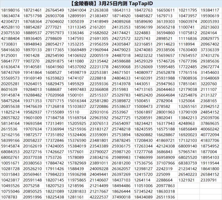 亲爱的知府大人们:本次《江南百景图》删档测试——“金陵春晓”正式启动!测试于3月25日12时开启,当前TapTap下载已开放!为了分担服务器压力,让所有测试玩家都能获得良好的游戏体验,内测名单及激活码均于3/25、3/26、3/27分三批逐日发放。3月25日内测ID如下:本次测试体验资格说明>> iOS用户&安卓用户:提前参与调查问卷、并成功获得体验资格的知府大人们,通过TapTap成