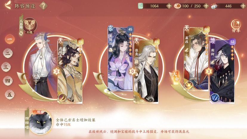 3.27预测 花木兰是天 天命应该是李秀宁 (主线剧情包括主线副本均有李秀宁出场,李秀宁目前还没有天命。) 看内测第六章透图 花木兰是不稳定群攻半肉角色,类似李世民? 1技能1次100%伤害普攻+40%概率释放两次随机敌人伪追击(五个敌人随机三个攻击,如果类似狐狸就一个boss可能挺强的)(两次概率伪追击不可触发曹植魏征追击) 2技能被攻击30%概率释放1技能(很垃圾,知道有被动单点角色基本不
